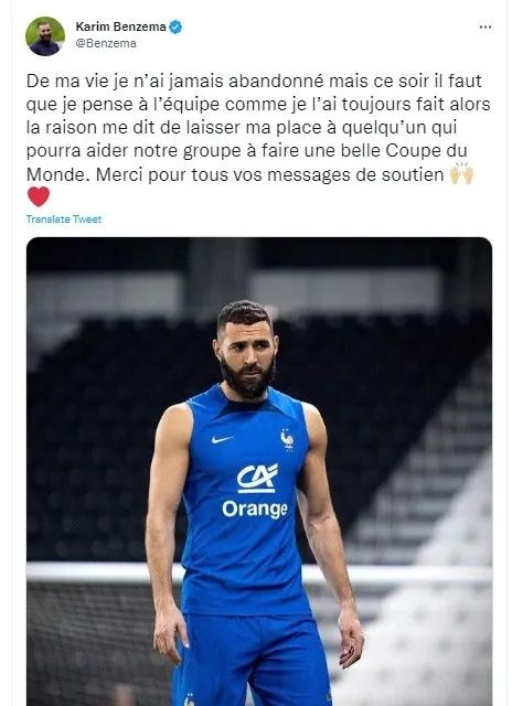 法国球星本泽马在推特上透露了自己无法参加卡塔尔世界杯的消息