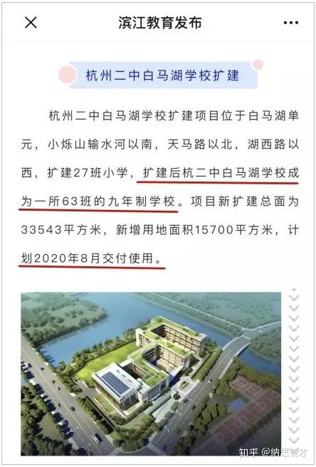 根据滨江教育发布2020年1月2日发布的信息,杭州二中白马湖学校将扩建27班小学。扩建后, 杭二中白马湖学校将成为一所63班的九年制学校 。
