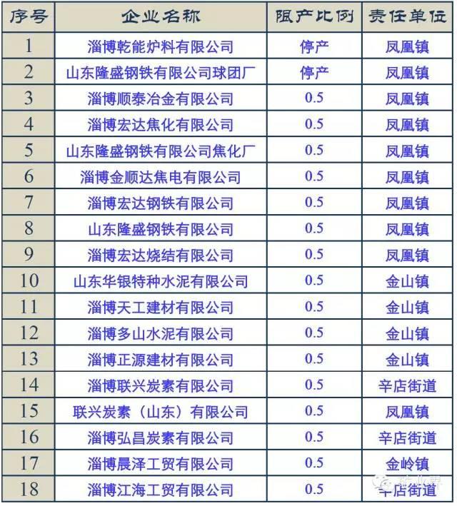 冬季大气污染防治工作时间为2015年11月15日至2016年3月15日,为期122天。重点管控对象为工业、生活、扬尘、机动车尾气四大类污染源。现对山东淄博市18个企业进行限产停产。