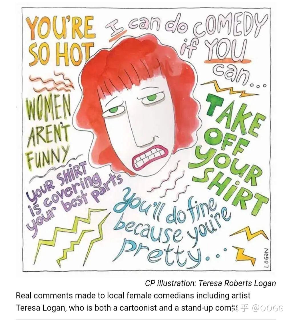 一张插画,描述了包括”女性不有趣“、”单口中常见的观众喝倒彩(Heckler)容易变成单纯的性骚扰“,”看脸就好“等女性在喜剧行业遭遇的刻板印象。