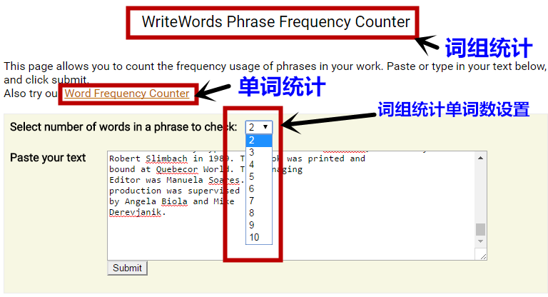 将点击Phrase Frequency counter,就讲单词词频统计转换成词组统计了。上图中可以选择统计的词组单词数量,可以选择2到10个单词构成的词组。这次选3字词组。