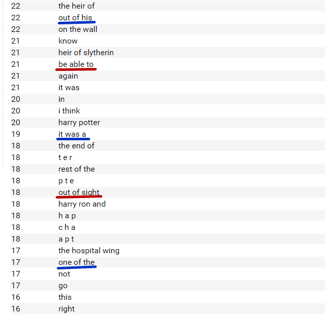 统计结果出来了。由于很多单词的组合本身并不是词组,只是由于意义组合反复出现而被统计了出来。比如It was a这个组合。其中还是可以统计出很典型的词组,比如be able to 和out of sight等。这个网站在统计词组时会插入一些单字词,是一个bug,不管就可以了。
