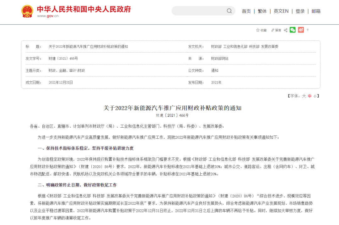 购置补贴政策,在2021年12月31日出台的《关于2022年新能源汽车推广应用财政补贴政策的通知》中已明确: