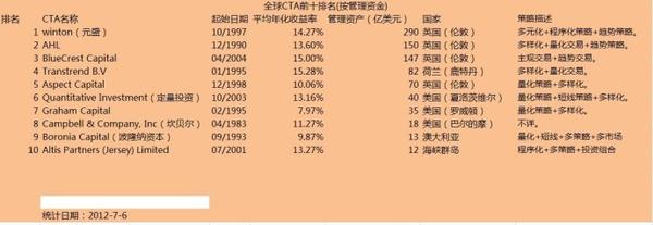 而到80年代之后,随着电子盘的普及,真正意义上的CTA基金才开始出现,并涌现出一批够格称得上开山鼻祖的人物,如Martin Lueck和David Harding。经过20多年的的大浪淘沙,下列CTA基金开始杀出重围。很有意思的几个趣闻给大家聊一聊,一是虽然该行业排名每年换血速度极快,城头更换大王旗很常见,但是真正做得好的却总是那几个灵魂人物,在各家公司跳来跳去或者自己另立门户;二是最大的几家CTA都是在英国,个人觉得主要是因为英国的氛围比较懒、经典而传统,比较符合这类型策略的风格;三是牛津和剑桥这两家学校历来都辈出CTA人才,这与当年AHL和Winton争风吃醋不无关系,你去跟牛津合作,俺就去剑桥设点:)