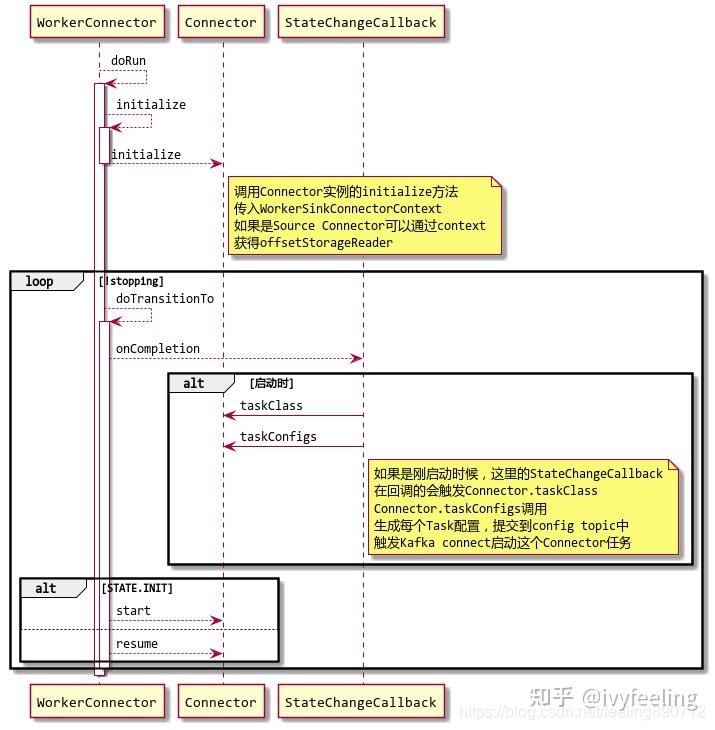 。 从taskClasss,taskConfigs两个方法的调用是Connector最主要的工作。由于Connector不是做实际的数据读写工作的,而这些工作是交由Conenctor对应的Task来处理的。那么Connector的主要工作就是创建对应的Task的配置,当Connector生成了Task的配置并且这些配置被放入Config的topic中后,会触发Kafka Connect新一轮的Rebalance,新的Rebalance结束后,这些Task也被分配到对应的Kafka Connect上面运行了,这个过程跟分配Connector是一样的。