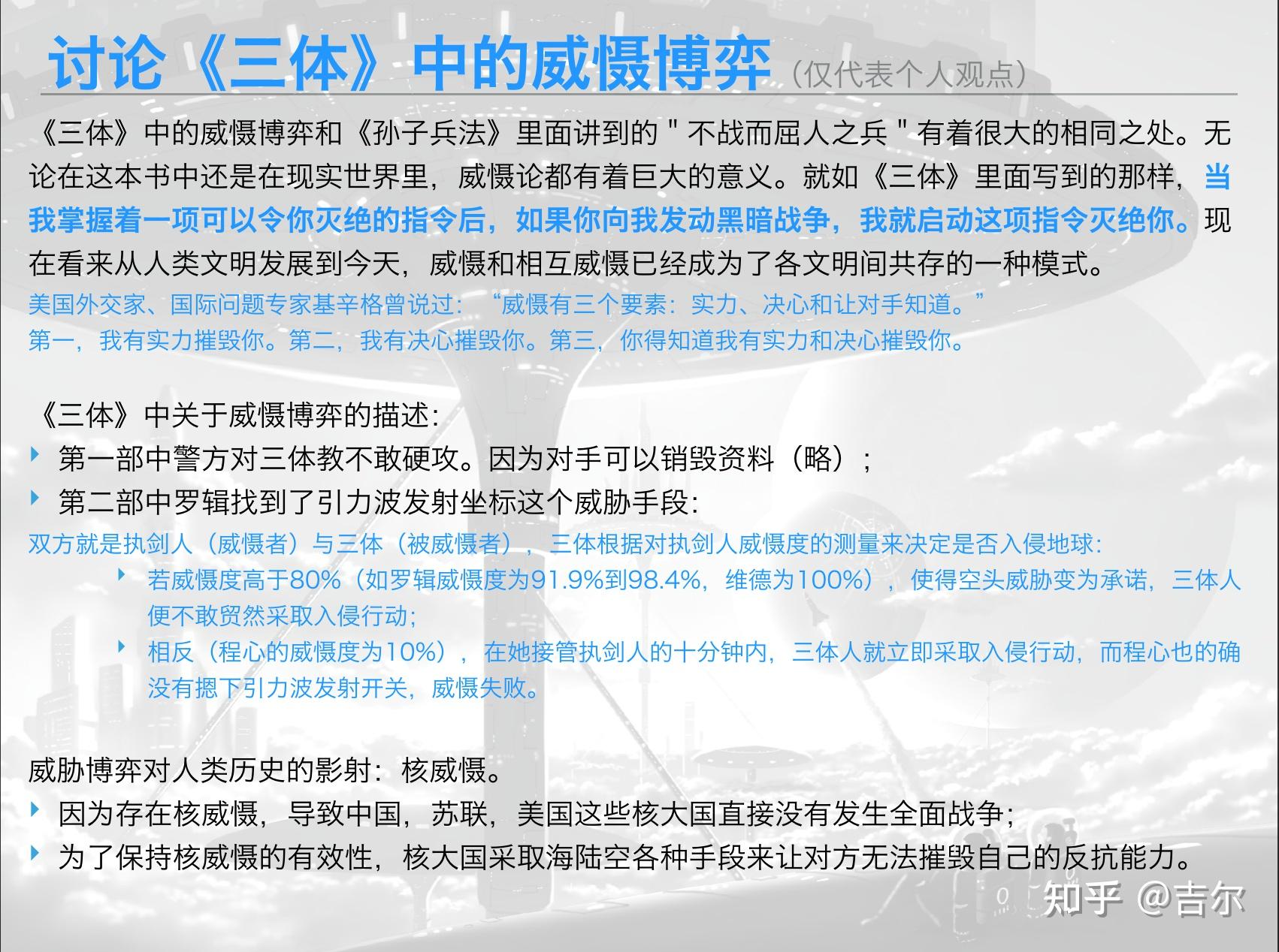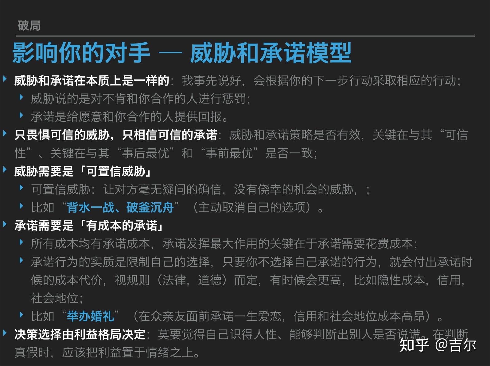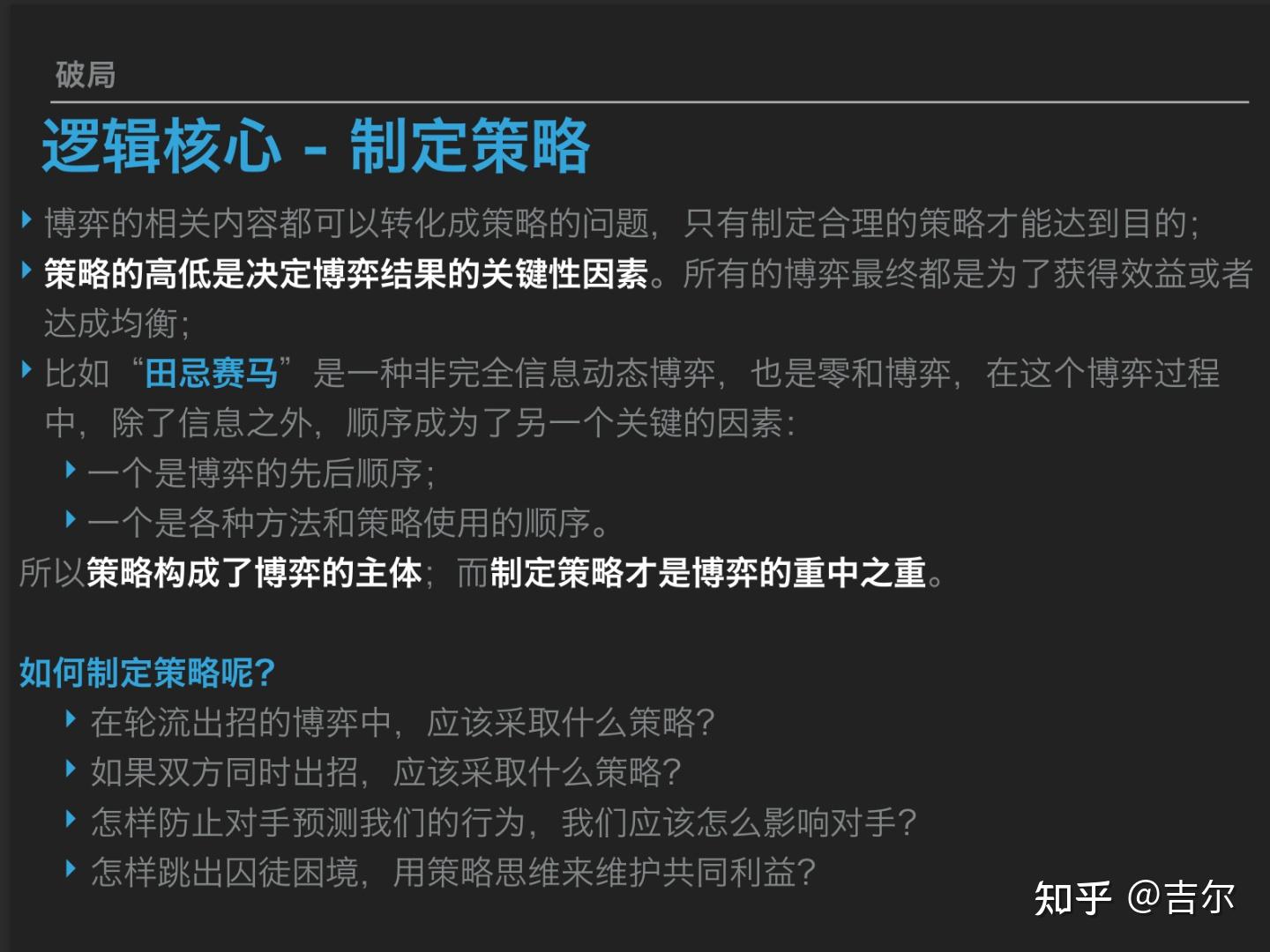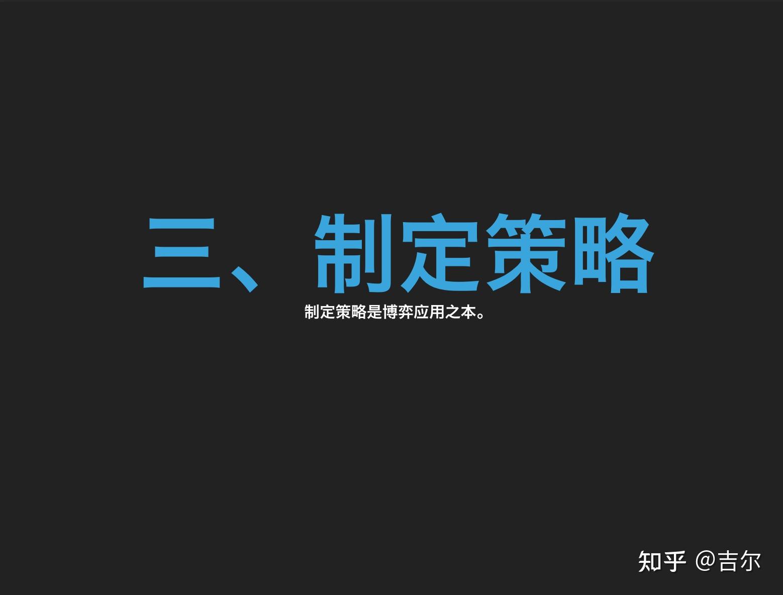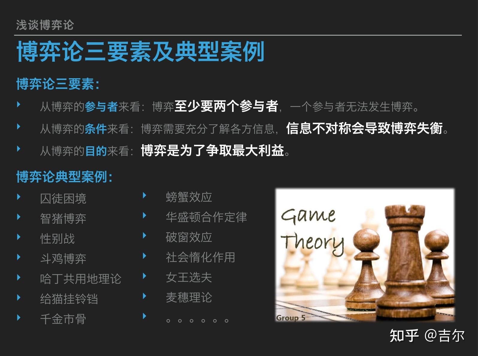关于浩如烟海的博弈论理论,我采撷了一些大而明亮的珍珠镶嵌在这页slide供你管中窥豹,虽不能揽全貌但可见一斑。首先我还是强调博弈论自西方舶来时就是用以在竞赛中取胜的理论,从它的英文名称 「Game Theory」 也能得知一二,本质上是在讨论 「定性取胜」。 思维模式上,思考优劣概率;区间取胜上,定性大于定量。博弈论同时强调了本理论是在 「互动」 中 「为本方争取最大利益的最优策略的理论」。