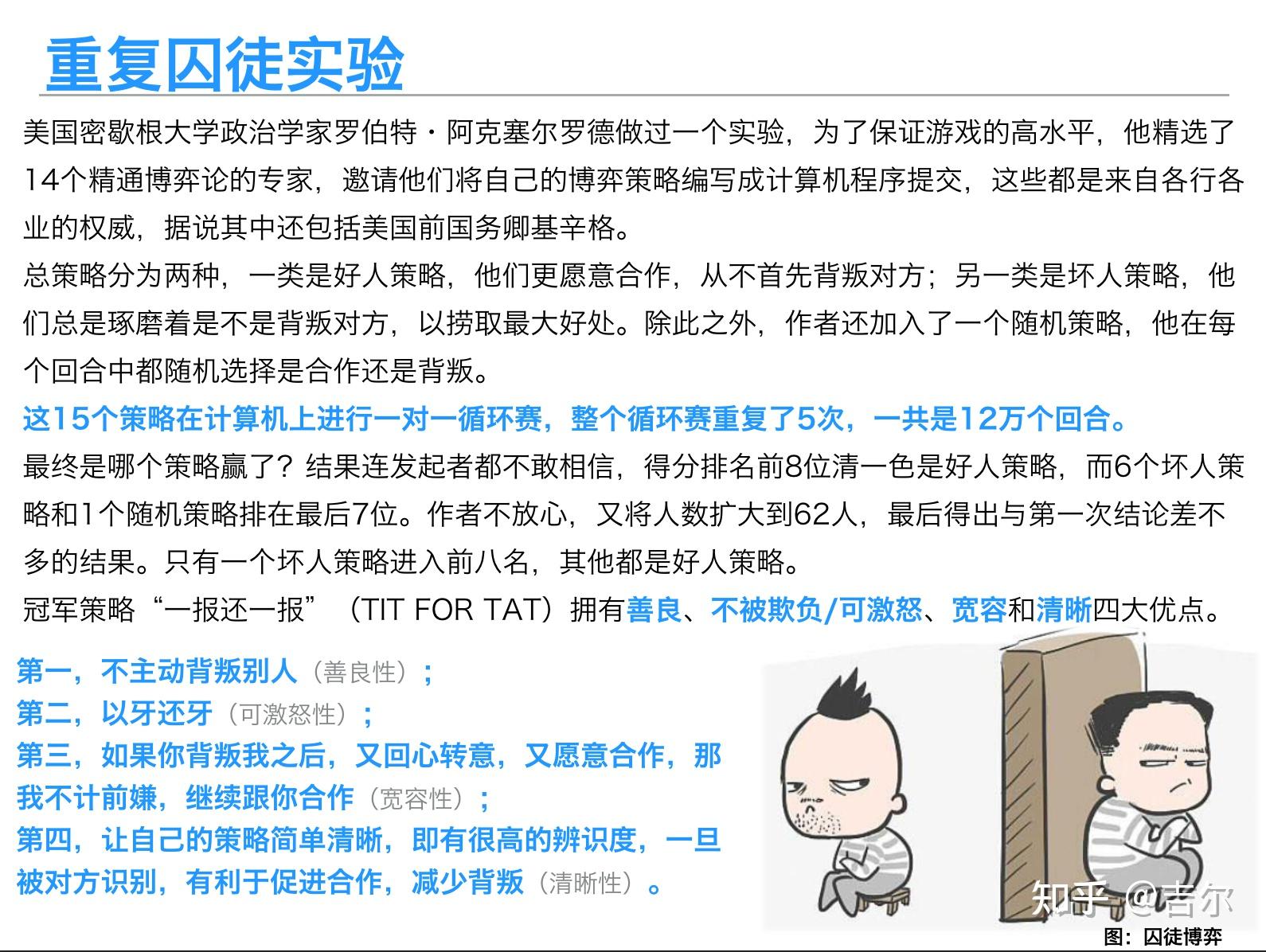 - 纳什均衡是利己主义者的优先策略 ;走出囚徒困境的一个有效方法,就是严格惩罚背叛行为,让博弈各方不敢背叛,这样来维护共同利益;