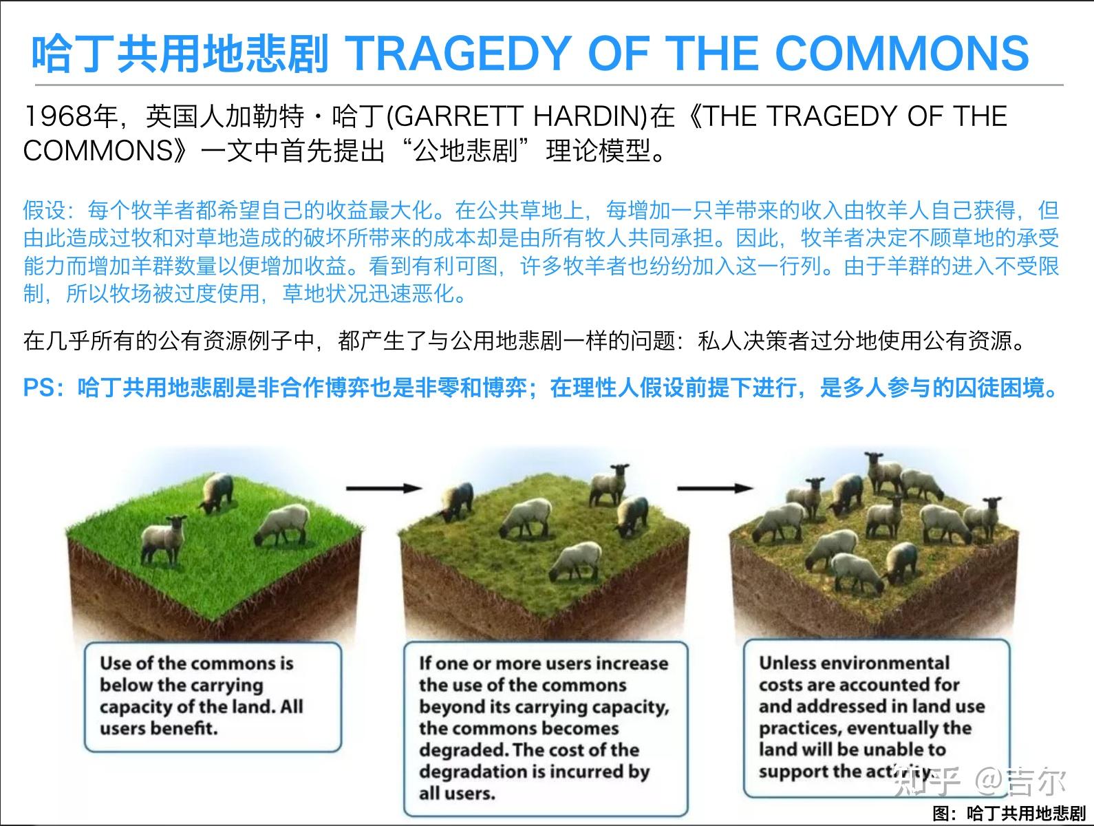囚徒困境跟三个因素有关, 一个是博弈各方在不同策略下的成本和收益,一个是博弈的次数,还有一个是参与人数。 这个思考角度就引出了下一个例子 -- 哈丁共用地悲剧。