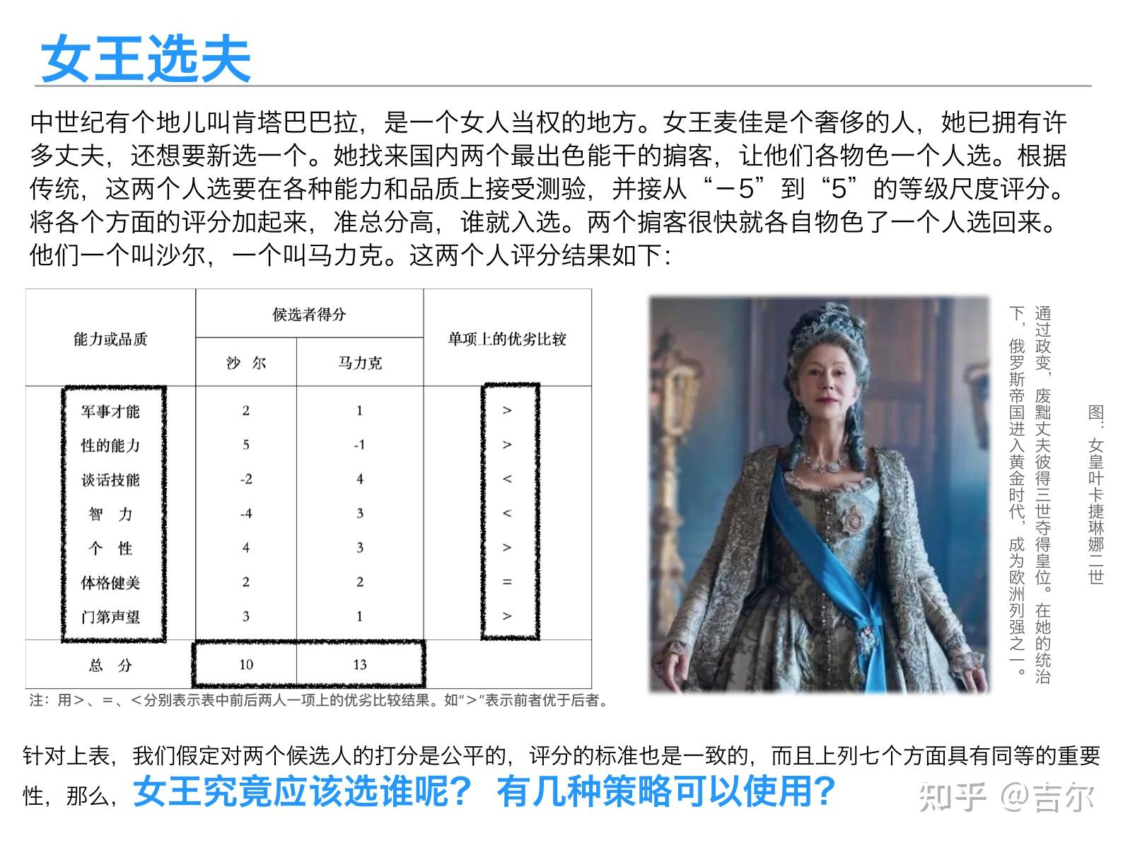 然而,这种评估“总的印象”的方法只是选择策略之一。实际上,这种对单项评估简单相加的方法并没有充分利用所获得的信息。如果我们从另一个角度——“维量比较”——来看,会发现在所有7个评估项目中,沙尔在4顶上占优势,有一项与马力克势均力敌,仅2项劣于马克力。那么同样存在一个朴素的原则:选择在较多维量上占优势的候选者。于是,应该入选的是沙尔而不是马力克。