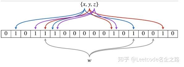 以上图为例,具体的操作流程:假设集合里面有3个元素{x, y, z},哈希函数的个数为3。首先将位数组进行初始化,将里面每个位都设置位0。