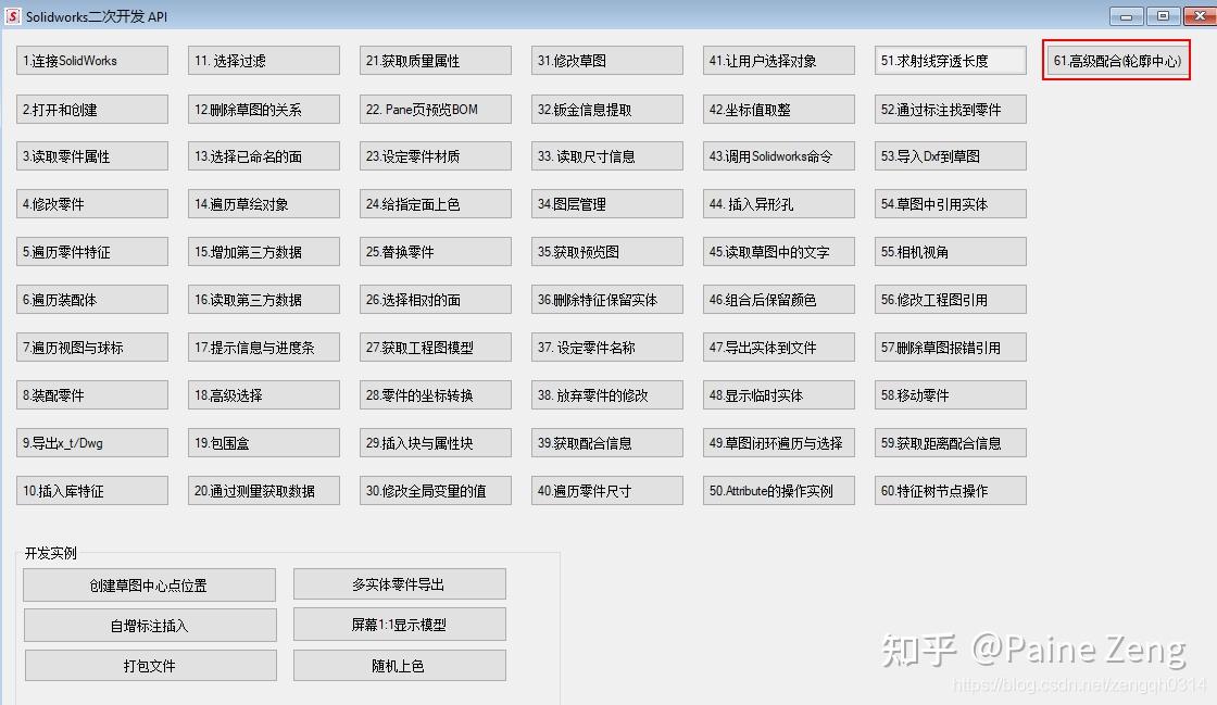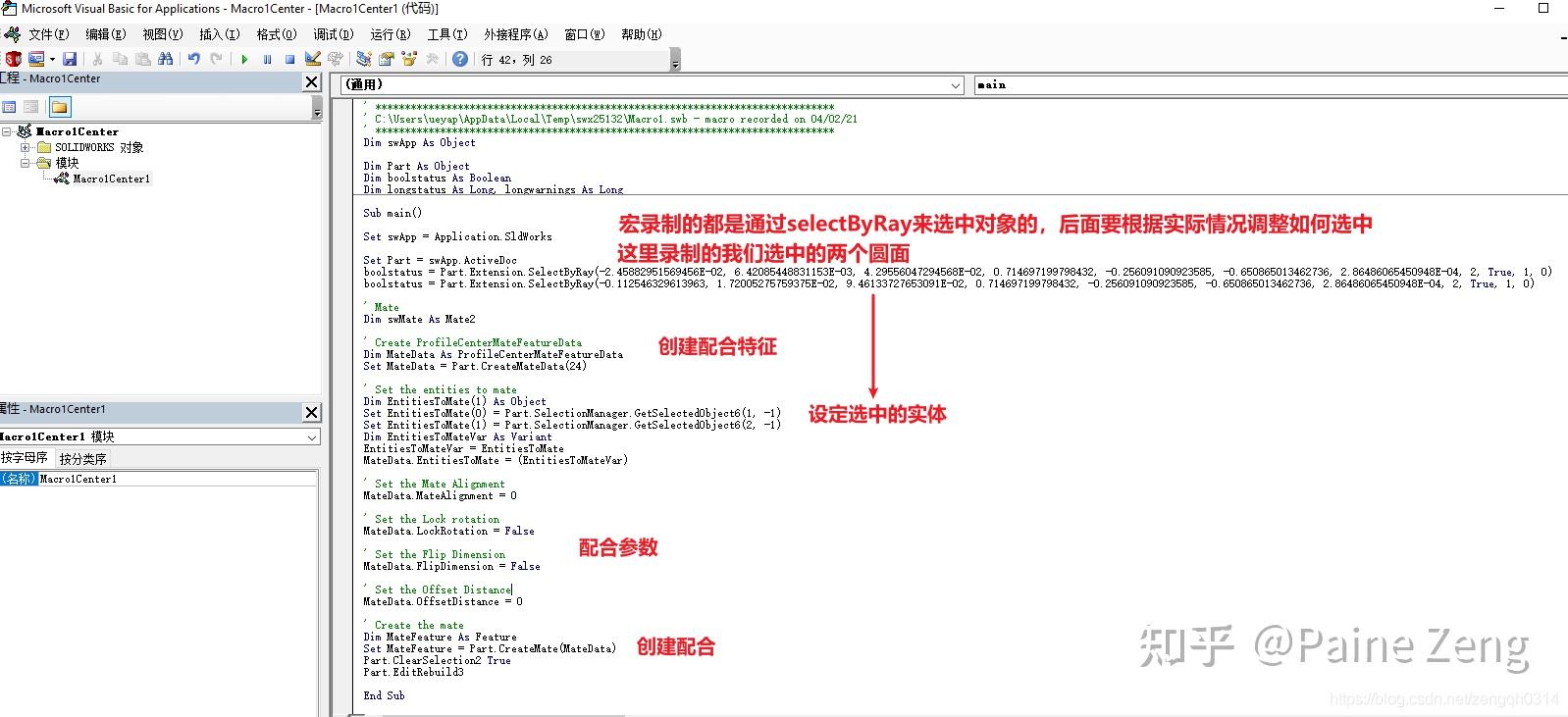 录制出来的宏,其实都有英文的注释。把Solidworks退回一步,取消掉我们刚刚手动配合的操作。 直接在VBA宏编辑器中按F5,Solidworks就再次把这个面中心的配合做好了。 下面是我大概注释的几步,大家可以参考修改为自己想要的代码,如 http:// vb.net 或者C#