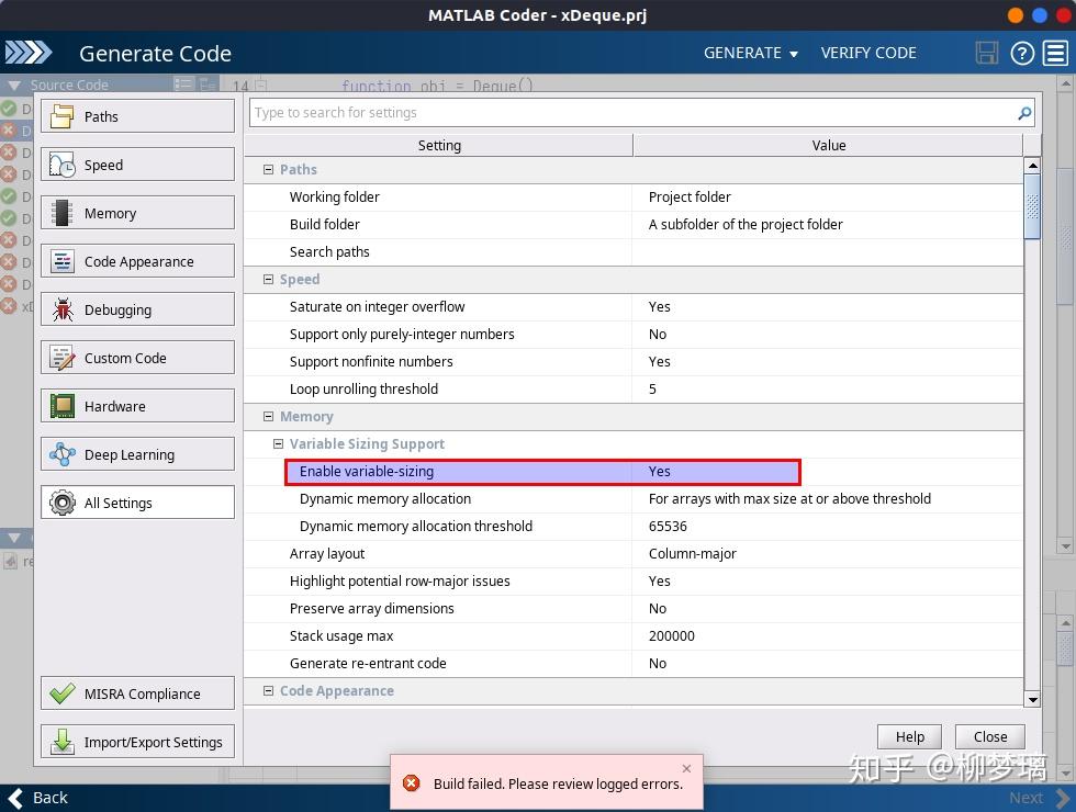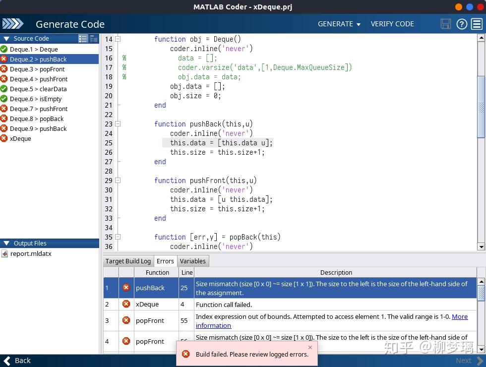 代码非常直接,直接使用MATLAB的index特性,也非常直观。coder.inline('never')保证每一个method都能被生成一个函数而不是内联函数,但是这会报错,错误如下,但是此时可变大小已经打开。