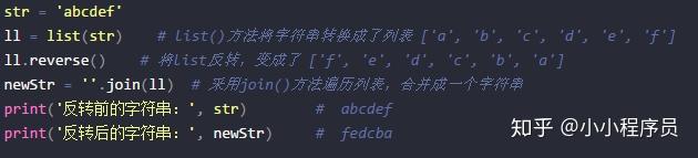 说明:Python中,列表可以进行反转,我们只要把字符串转换成列表,使用reverse()方法,进行反转,然后再使用字符串的join()方法遍历列表,合并成一个字符串。