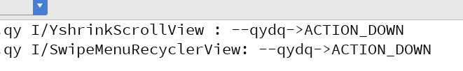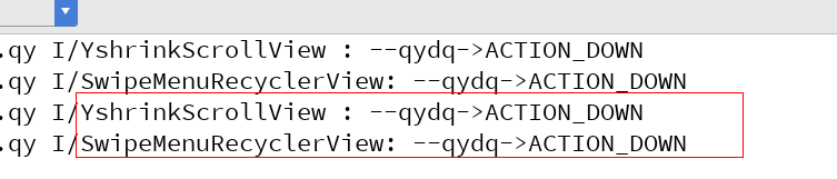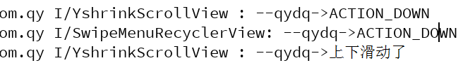 事件被传递到YshrinkScrollView中,YshrinkScrollView响应了事件,因为事件已经被拦截了,if(Math.abs(moveY - downRawY)>Math.abs(moveX - downRawX)&&Math.abs(moveY - downRawY)>5),这里有小判断,如果滑动距离大于5才代表上下滑动,可能手指有误差。这里也没有问题,我们接着测试左右滑动,先右滑看打印信息,再左滑。如下图所示