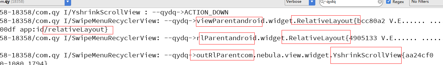 我们在SwipeMenuRecyclerView中做事件冲突的时候,getParent(),首先得到是id为relativeLayout的RelativeLayout的布局,再viewParent.getParent()得到另一个名为rlParent的RelativeLayout,rlParent.getParent()得到名为outRlParent的YshrinkScrollView。我们不防去增加以下打印信息。