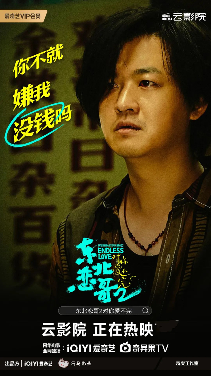 《东北恋哥2对你爱不完》由秦小珍执导,包贝尔、潘斌龙、江易轩、赵夕汐领衔主演,《一年一度喜剧大赛》人气选手叶浏,以及演员魏翔、乔杉等也参演了这部电影。该片已于1月23日(大年初二)起以“云影院首映”模式登陆爱奇艺,定价18元,爱奇艺VIP会员半价。