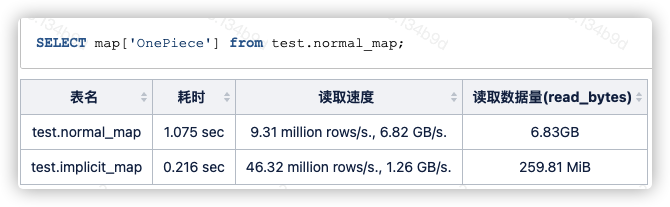 此次测试中Map类型隐式列对于指定key值的查询场景有显著的性能提升。