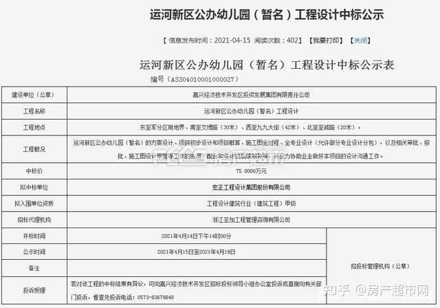 4月,运河新区公办幼儿园(暂名)工程已进行了中标公示。