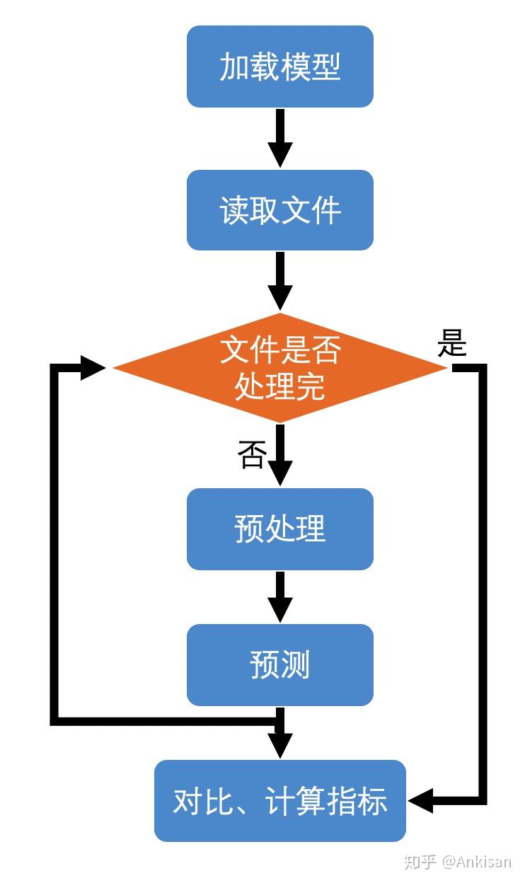 模型在测试集上进行测试知道吧?读取文件后调用模型对每条case进行预测,最后将所有预测结果和正确答案对比,计算出各种指标。整个流程如下图: