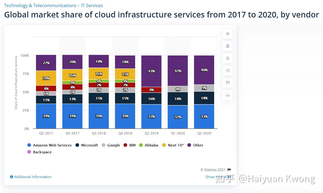 据Statista数据显示,2020年AWS的IaaS市场份额为 33% ,领先于微软Azure的这一块市场份额( 占18% ) ,而谷歌云计算的市场份额就更低了( 仅9% )。
