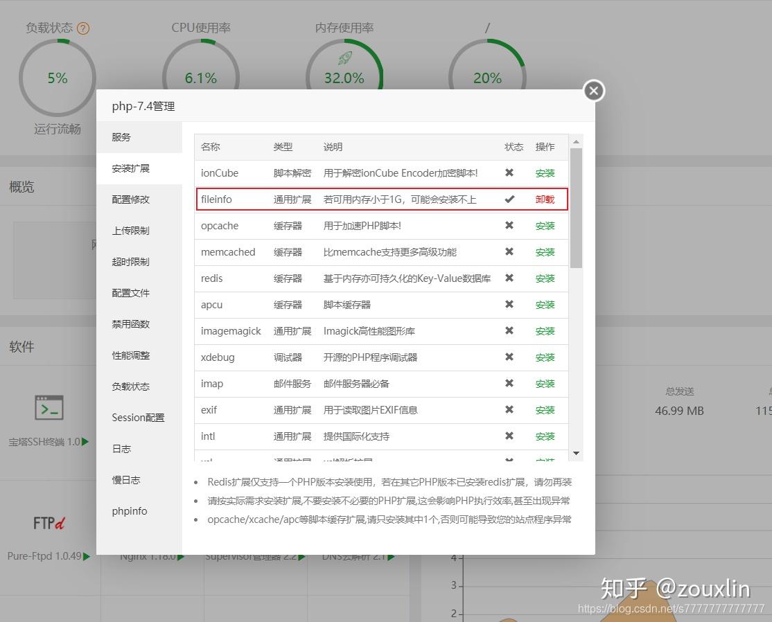首页→php-X.X→安装扩展(如果首页没有此软件,则在软件商店 已安装 分类中打开)