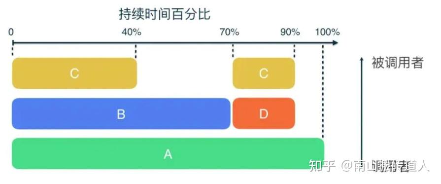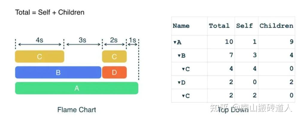 - 值得注意的是,D 节点只是调用了 C,自己没做任何事,这种情况在方法封装时很常见。所以 D 的 Children Time 和 Total Time 都是 2。