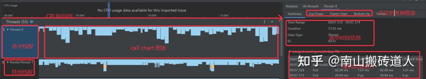 - as profiler CPU性能录制是按照线程处理的,所以先要选择线程,然后cpu时间线上选择一个时间范围