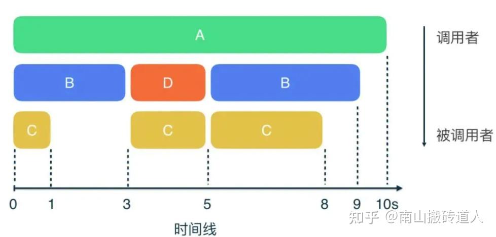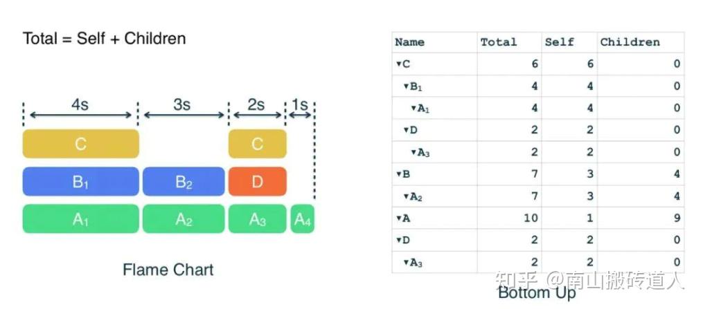 - A 消耗了 1 秒钟来运行自己的代码,所以 Self Time 是 1;