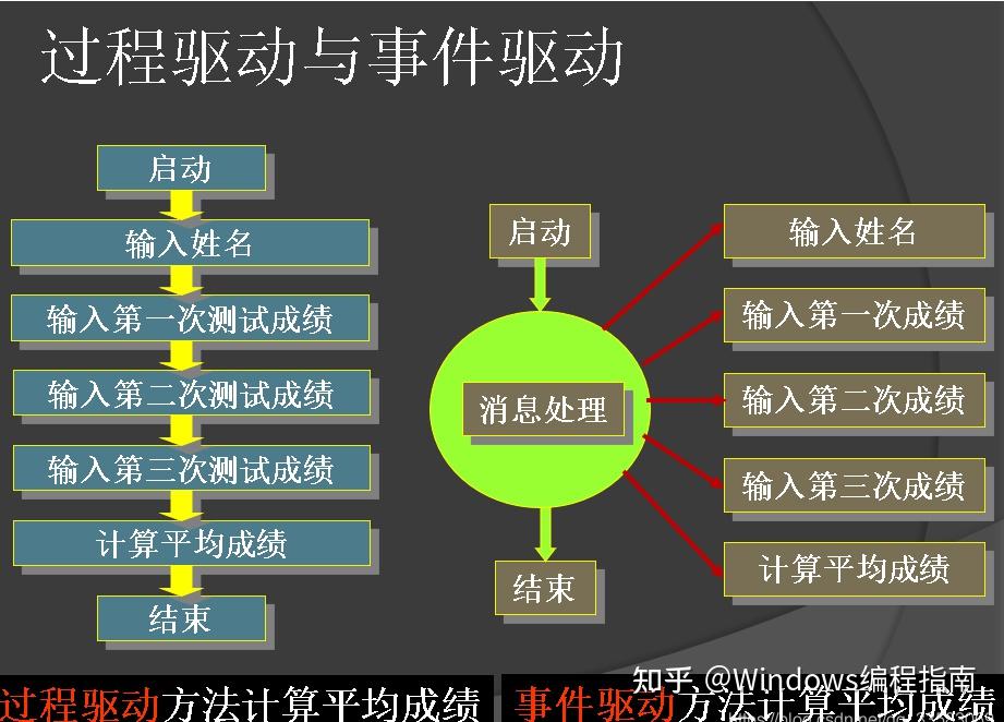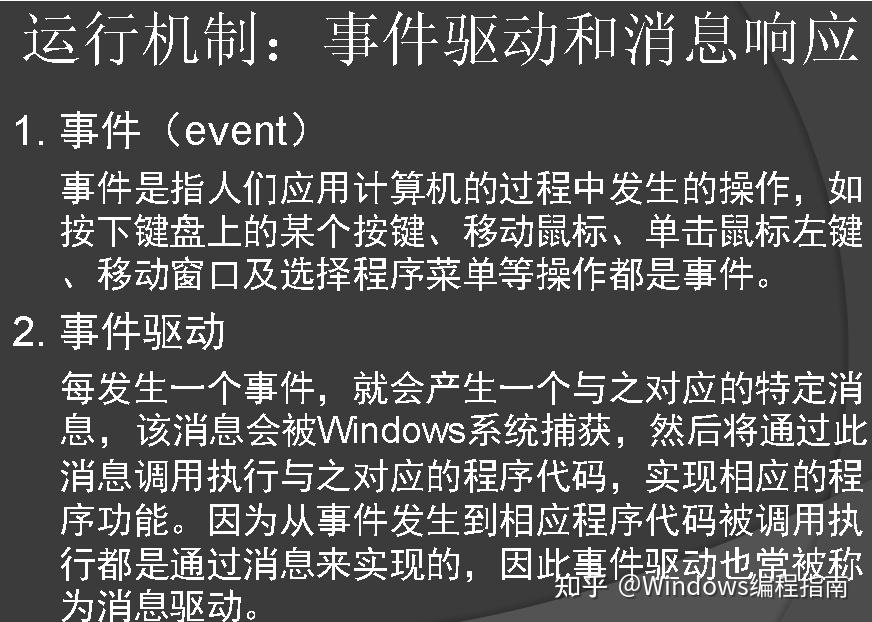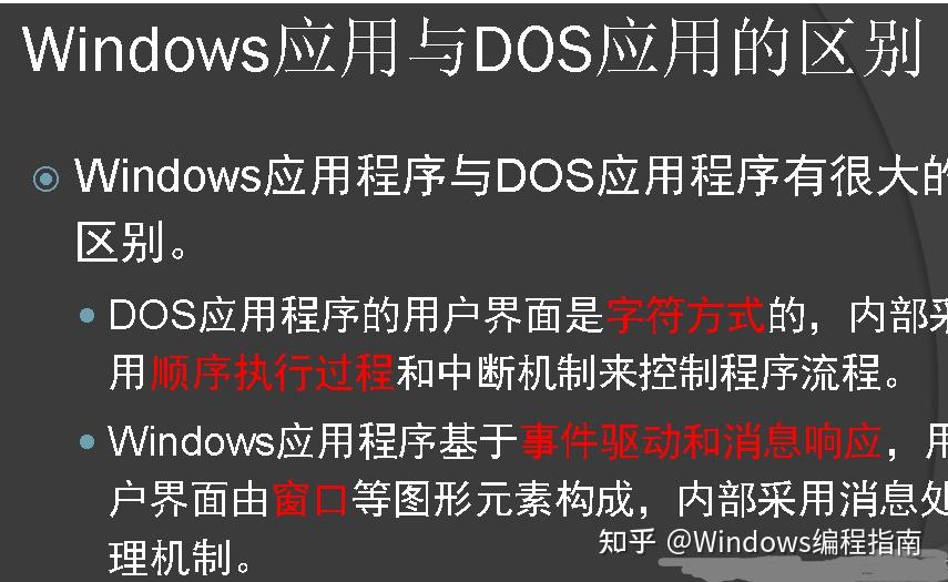 在DOS里,程序能直接控制事件的发生顺序;而在Windows里,应用程序不直接调用任何窗口函数,而是等待Windows调用窗口函数,请求完成任务或返回信息。
