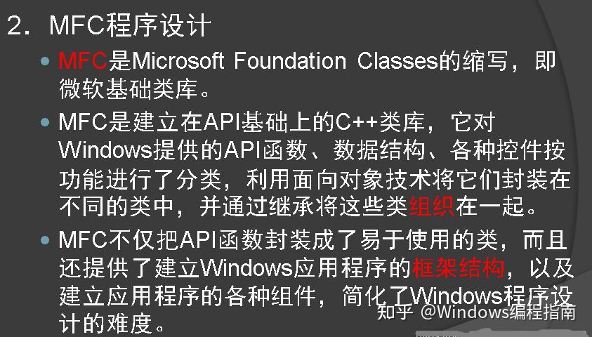 MFC类库包括用来开发C++应用程序和Windows应用程序的一组类,这些类用来表示窗口、对话框、设备上下文、公共GDI对象如画笔、调色板、控制框和其它标准的Windows部件,封装了大部分的Windows API函数
