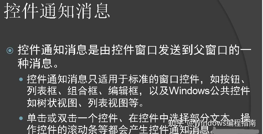 (2)仿命令消息的格式,如用户修改了编辑控件中的文本后,编辑控件向父窗口发送的WM_COMMAND通知消息,该消息包含了控件通知消息EN_CHANGE。