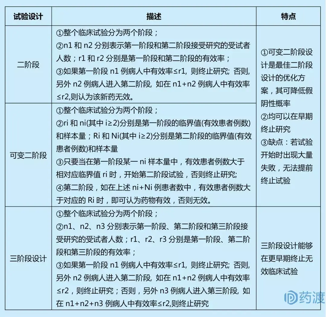 单臂多阶段设计一般用于探索性研究,其优点在于多阶段设计有明确的早期终止研究的准则,当试验药的有效率较低时,可以在早期终止研究,避免更多的受试者接受无效的治疗;多阶段设计也可用来早期淘汰不良反应高的药物。