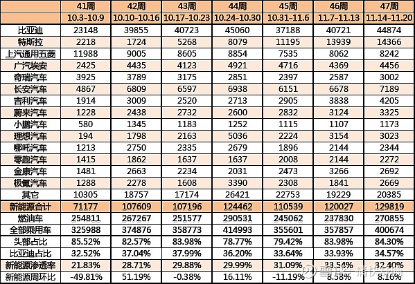 新能源 上险量为129,819辆,环比增长8.2%,同比增长64%。前三周新能源上险量为360,385辆,同比增长56%。预计11月新能源上险量在50-55万辆。
