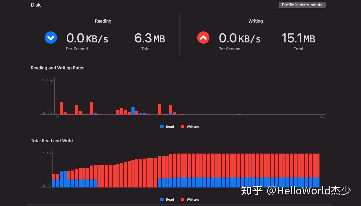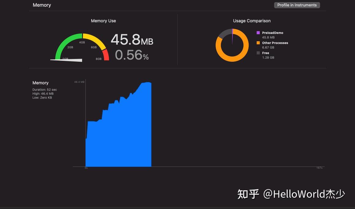 虽然我在上面对我的应用增加了并发操作,但是我一看 Xcode 的性能分析,我不禁陷入了沉思,我的应用程序太吃内存了,加入我不停的刷,那我的手机应该迟早会把我的应用给终止掉,下图是我刷到 200 行的时候的性能分析图: