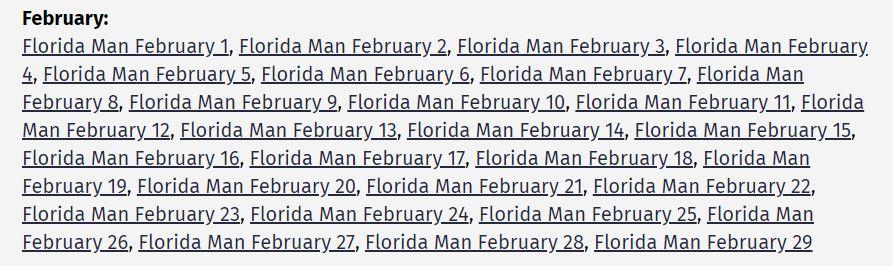 “ 佛罗里达男人 ” 挑战火起来之后,一些贴心的网站把一年 366 天所发生过的沙雕新闻都列了出来( 年份不计,连闰年都算上了 ),方便网友查询。