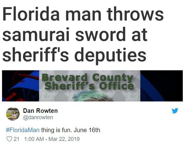 比如这位叫 Dan Rowten 的网友发现,他生日那天曾有个佛罗里达男人将一把武士刀丢向了当地治安官的副官。