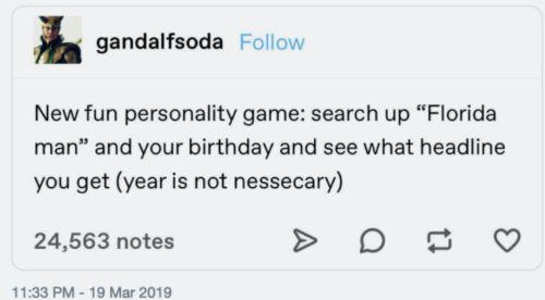 最开始,这个活动是 Tumblr 上一个叫做 “ gandalfsoda ” 的网友发起的,他当时发了一条内容 “ 快去试试用谷歌搜索 Florida Man 加上你的生日,看看你能搜到什么样的新闻 ”。