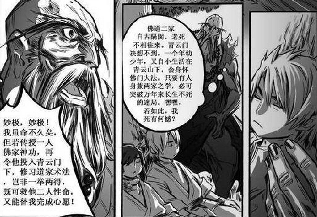 临死前为了完成心愿,传授意志坚韧的张小凡佛家法术。待青云门收留他后,再习得道家法术。以此让佛家、道家两家法术相互印证,取长补短。