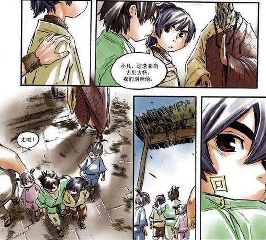 主角 张小凡 和玩伴 林惊羽 等人在村中打闹玩耍。