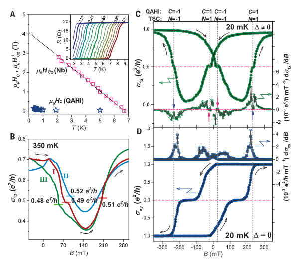 然后是 超导/量子反常霍尔效应平台。 在这种平台里,量子霍尔效应的电导应该是e^2/h的整数倍。而如果出现majorana的话,电导可能会产生1/2 * e^2/h的平台。2017年,UCLA的Kanglong wang组发表science,宣称实现了手性Majorana。在磁场扫描中(图c),发现电导出现了半整数的平台。