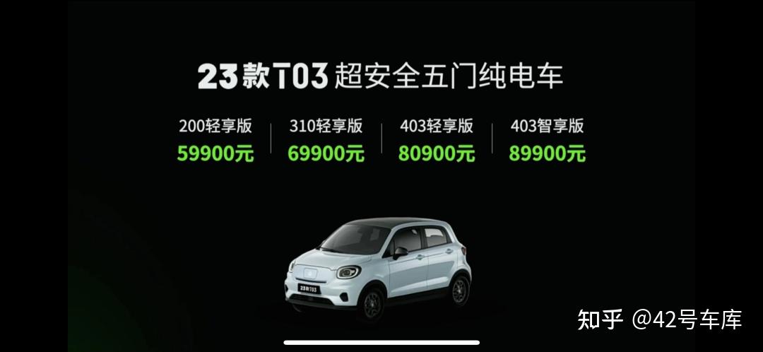 23 款零跑 T03 的售价为 5.99 万元—8.99 万元,共四款配置,三款电池容量。