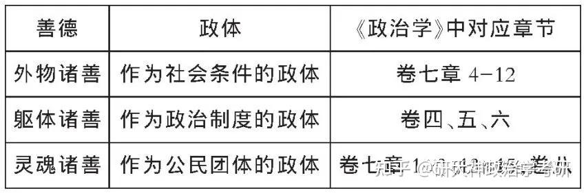 正如本文前面所论述,亚里士多德的政体观念是一个体系,其理想政体也是如此。而且在亚里士多德看来,城邦的最高目的是为了实现善的生活。而善的生活需要具备三项善因,而这刚好与政体的三个层次相互对应。根据《政治学》中的基本内容可以制作出简单的表格(见下表)。需要说明的是,《政治学》中对应的章节只是一个粗略的划分,毕竟亚里士多德的《政治学》不像现代学术著作那样结构严密。