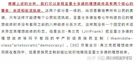 【总结】 这一部分,作者从两个问题出发来进行探讨,其一,亚里士多德的思想中到底有没有一个理想政体的图景。其次,如果存在亚里士多德的理想政体,那么这个政体是什么?共和政体,君主制还是贵族制?由此指出亚里士多德的理想政体其实是以中庸为原则、以中产阶级为基础的一种混合政体,这和考研同学书本上是一致的。