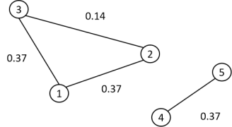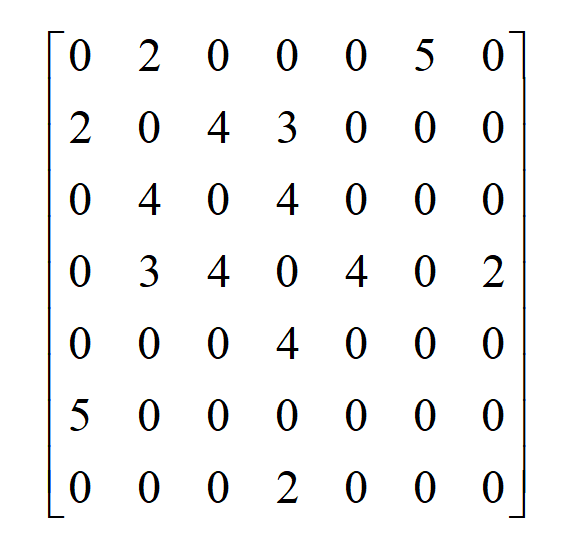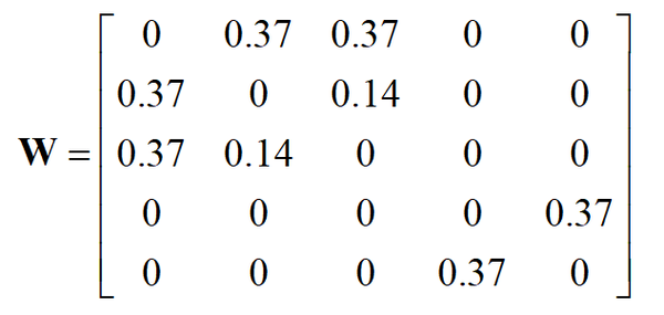 图的边可以是有方向的,也可以是没有方向的,前者称为有向图,后者称为无向图。邻接矩阵是图的矩阵表示,借助它可以方便地存储图的结构,用线性代数的方法研究图的问题。如果一个图有 n 个顶点,其邻接矩阵 W 为 n\times n 的矩阵,矩阵元素 w_{ij} 表示边 (i,j) 的权重。如果两个顶点之间没有边连接,则在邻接矩阵中对应的元素为0。对与上面的图,它的邻接矩阵为