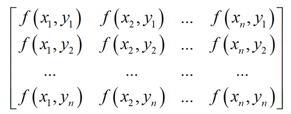 如果上面的二元函数进行离散化,对自变量的一系列点处的函数值进行采样,得到下面一系列点处的函数值,构成一个矩阵