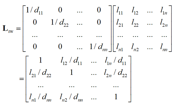 其位置 (i,j),i\ne j 的元素为将未归一化拉普拉斯矩阵对应位置处的元素 l_{ij} 除以 d_{ii} 后形成的,主对角线元素也为1