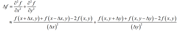 下面考虑多元函数的偏导数。对于二元函数 f(x,y) ,其拉普拉斯算子可以用下面的公式近似计算