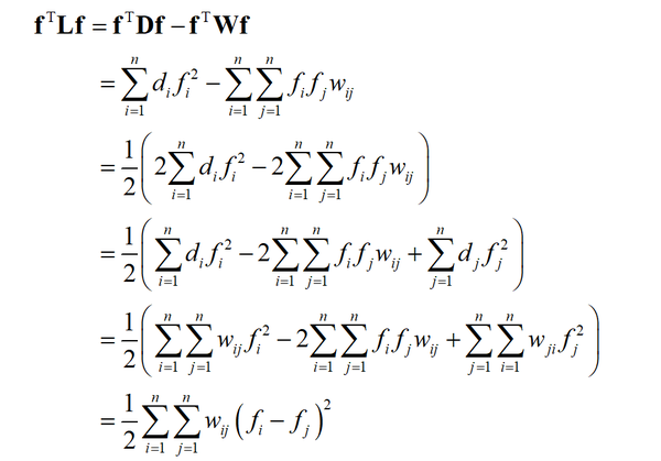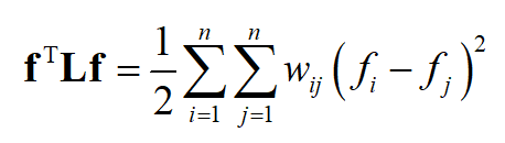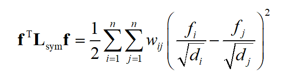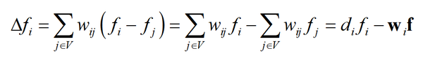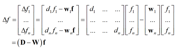 这里的 d_{i} 就是顶点 i 的加权度, w_{i} 邻接矩阵的第 i 行, f 是所有顶点的值构成的里列向量, w_{i}f 是二者的内积。对于图的所有顶点,有