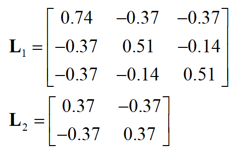 显然每个子矩阵 L_{i} 自身也是一个拉普拉斯矩阵,对应于这个联通分量。对于这些子矩阵,上面的结论也是成立的,因此 L 的谱由 L_{i} 的谱相并构成, L 的特征值0对应的特征向量是 L_{i} 的特征向量将其余位置填充0扩充形成的。具体的,特征向量中第 i 个联通分量的顶点所对应的分量为1,其余的全为0,为如下形式