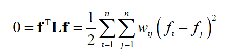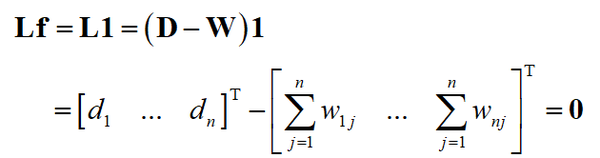 这是因为 Lf=0f=0 。因为图是联通的,因此所有的 w_{ij}>0 ,要让上面的值为0,必定有 f_{i}-f_{j}=0 。这意味着向量 f 的任意元素都相等,因此所有特征向量都是 1 的倍数,结论成立。